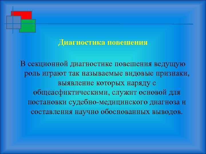 Диагностика повешения В секционной диагностике повешения ведущую роль играют так называемые видовые признаки, выявление которых наряду с общеасфиктическими, служит основой для постановки судебно-медицинского диагноза и составления научно обоснованных выводов.