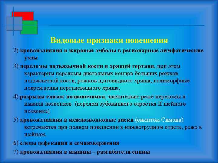 Видовые признаки повешения 2) кровоизлияния и жировые эмболы в регионарные лимфатические узлы 3) переломы подъязычной кости и хрящей гортани, при этом характерны переломы дистальных концов больших рожков подъязычной кости, рожков щитовидного хряща, полиморфные повреждения перстневидного хряща. 4) разрывы связок позвоночника, значительно реже переломы и вывихи позвонков (перелом зубовидного отростка II шейного позвонка) 5) кровоизлияния в межпозвонковые диски (симптом Симона) встречаются при полном повешении в нижнегрудном отделе, реже в шейном. 6) следы дефекации и семяизвержения 7) кровоизлияния в мышцы – разгибатели спины