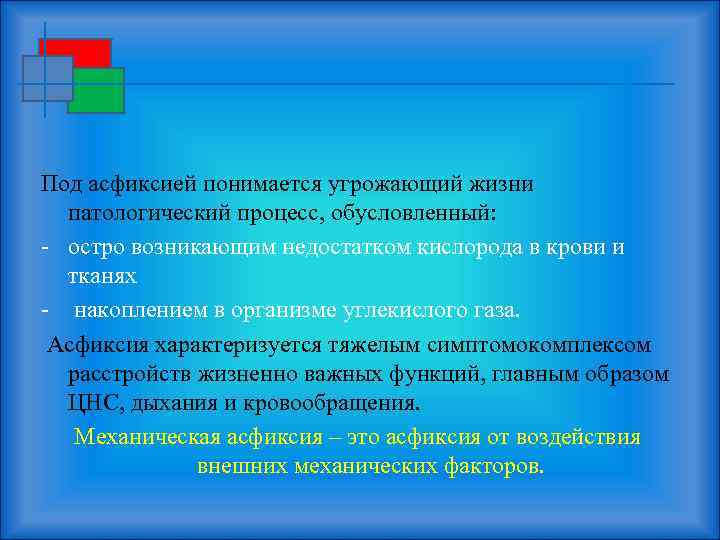 Под асфиксией понимается угрожающий жизни патологический процесс, обусловленный: - остро возникающим недостатком кислорода в крови и тканях - накоплением в организме углекислого газа. Асфиксия характеризуется тяжелым симптомокомплексом расстройств жизненно важных функций, главным образом ЦНС, дыхания и кровообращения. Механическая асфиксия – это асфиксия от воздействия внешних механических факторов.