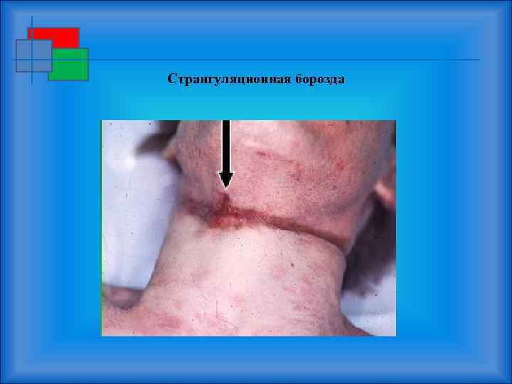 Дифферециальная диагностика удавления и повешения Удавление Повешение странгуляционная борозда: • расположена в средней трети шеи • расположена в верхней трети шеи • горизонтальная • равномерная по глубине • замкнутая • косо-восходящая , в положении лежа -горизонтальная • неравномерная по глубине, наиболее глубокая на поверхности шеи противоположной узлу. • незамкнутая (ветви борозды не смыкаются)