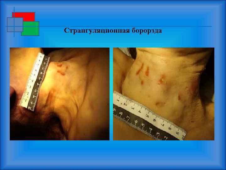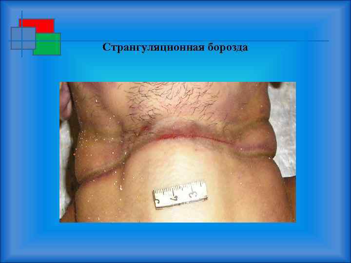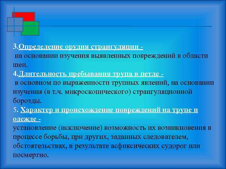 3. Определение орудия странгуляции на основании изучения выявленных повреждений в области шеи. 4. Длительность пребывания трупа в петле в основном по выраженности трупных явлений, на основании изучения (в т. ч. микроскопического) странгуляционной борозды. 5. Характер и происхождение повреждений на трупе и одежде установление (исключение) возможность их возникновения в процессе борьбы, при других, заданных следователем, обстоятельствах, в результате асфиксических судорог или посмертно.