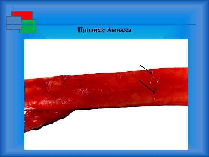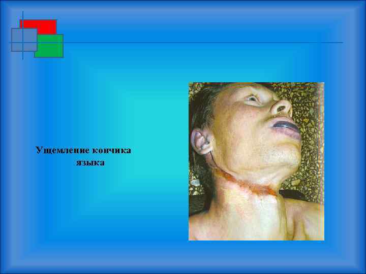 Видовые признаки повешения 8) циркулярное расположение трупных пятен на кистях, предплечьях, голенях, экхимозы на их фоне 9) анизокория –как признак сдавления симпатического нерва 10) ущемление кончика языка; кровоизлияние в язык , заглазничную клетчатку, глотку 11) кровотечение из носа, и ушей (отмечаются потеки крови) 12) кровоизлияние в области прикрепления кивательных мышц к грудине 13) параллельно расположенные горизонтальные надрывы интимы сонных артерий (признак Амюсса) и кровоизлияния в адвентицию этих сосудов (признак Мартина) 14) симптом Фриберга (локальная вакуолизация интимы сонных артерий) 15) удлинение шеи (иногда до 20 -30 см) 16) перелом зубовидного отростка II шейного позвонка