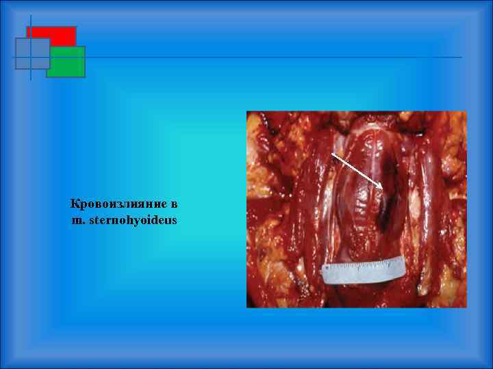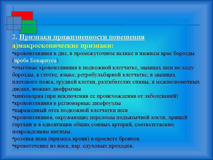 2. Признаки прижизненности повешения а)макроскопические признаки: • кровоизлияния в дне, в промежуточном валике и нижнем крае борозды (проба Бокариуса) • очаговые кровоизлияния в подкожной клетчатке, мышцах шеи по ходу борозды, в глотке, языке, ретробульбарной клетчатке, в мышцах плечевого пояса, грудной клетки, разгибателях спины, в межпозвоночных дисках, ножках диафрагмы • анизокория (при исключении ее происхождения от заболеваний) • кровоизлияния в регионарные лимфоузлы • выраженный отек подкожной клетчатки шеи • кровоизлияния, окружающие переломы подъязычной кости, хрящей гортани и в адвентиции общих сонных артерий, соответственно повреждениям интимы. • розовая пена (примесь крови) в просвете бронхов • кровотечение из носа, нар. слуховых проходов.