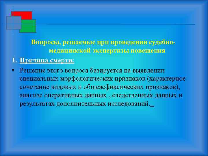 Вопросы, решаемые при проведении судебномедицинской экспертизы повешения 1. Причина смерти: • Решение этого вопроса базируется на выявлении специальных морфологических признаков (характерное сочетание видовых и общеасфиксических признаков), анализе оперативных данных , следственных данных и результатах дополнительных исследований.