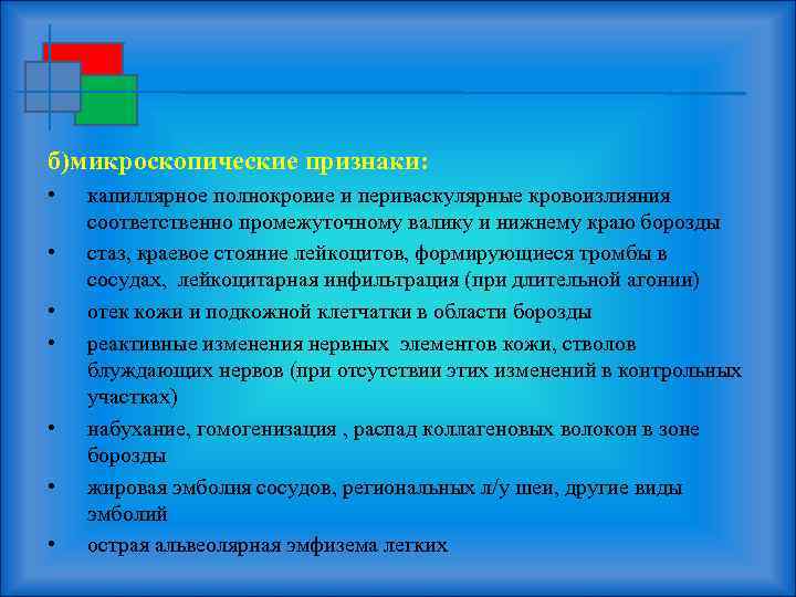 б)микроскопические признаки: • • капиллярное полнокровие и периваскулярные кровоизлияния соответственно промежуточному валику и нижнему краю борозды стаз, краевое стояние лейкоцитов, формирующиеся тромбы в сосудах, лейкоцитарная инфильтрация (при длительной агонии) отек кожи и подкожной клетчатки в области борозды реактивные изменения нервных элементов кожи, стволов блуждающих нервов (при отсутствии этих изменений в контрольных участках) набухание, гомогенизация , распад коллагеновых волокон в зоне борозды жировая эмболия сосудов, региональных л/у шеи, другие виды эмболий острая альвеолярная эмфизема легких