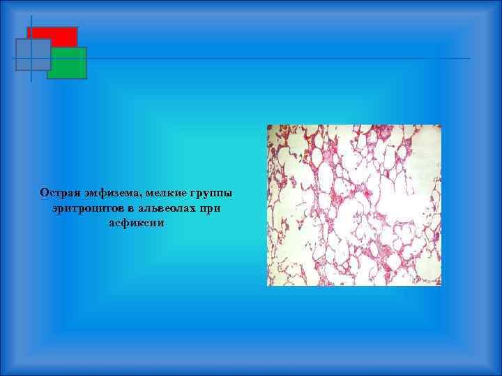 Острая эмфизема, мелкие группы эритроцитов в альвеолах при асфиксии