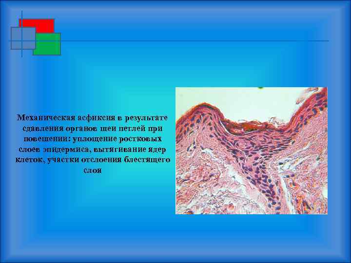 Механическая асфиксия в результате сдавления органов шеи петлей при повешении: уплощение ростковых слоев эпидермиса, вытягивание ядер клеток, участки отслоения блестящего слоя