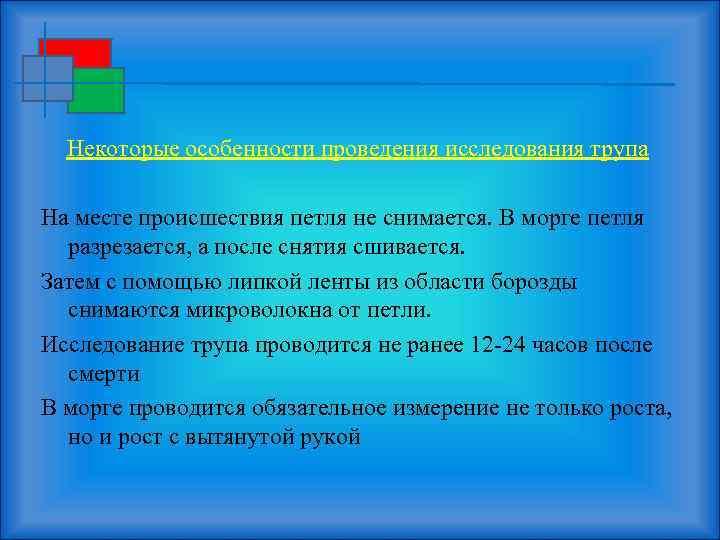 Некоторые особенности проведения исследования трупа На месте происшествия петля не снимается. В морге петля разрезается, а после снятия сшивается. Затем с помощью липкой ленты из области борозды снимаются микроволокна от петли. Исследование трупа проводится не ранее 12 -24 часов после смерти В морге проводится обязательное измерение не только роста, но и рост с вытянутой рукой