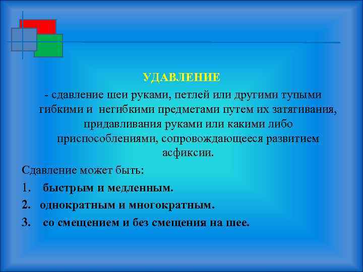 УДАВЛЕНИЕ - сдавление шеи руками, петлей или другими тупыми гибкими и негибкими предметами путем их затягивания, придавливания руками или какими либо приспособлениями, сопровождающееся развитием асфиксии. Сдавление может быть: 1. быстрым и медленным. 2. однократным и многократным. 3. со смещением и без смещения на шее.