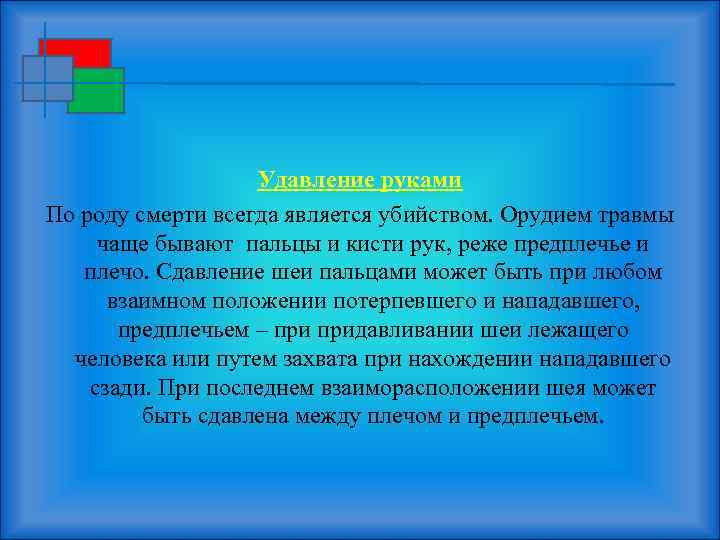 Удавление руками По роду смерти всегда является убийством. Орудием травмы чаще бывают пальцы и кисти рук, реже предплечье и плечо. Сдавление шеи пальцами может быть при любом взаимном положении потерпевшего и нападавшего, предплечьем – придавливании шеи лежащего человека или путем захвата при нахождении нападавшего сзади. При последнем взаиморасположении шея может быть сдавлена между плечом и предплечьем.