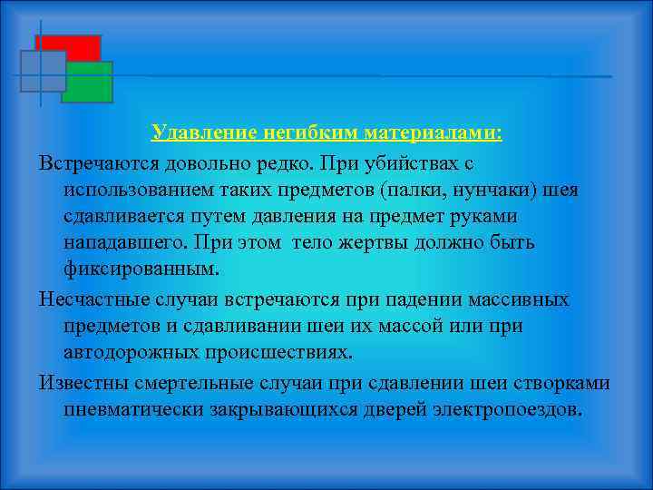 Удавление негибким материалами: Встречаются довольно редко. При убийствах с использованием таких предметов (палки, нунчаки) шея сдавливается путем давления на предмет руками нападавшего. При этом тело жертвы должно быть фиксированным. Несчастные случаи встречаются при падении массивных предметов и сдавливании шеи их массой или при автодорожных происшествиях. Известны смертельные случаи при сдавлении шеи створками пневматически закрывающихся дверей электропоездов.
