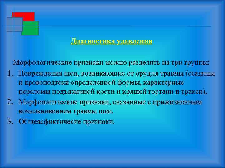 Диагностика удавления Морфологические признаки можно разделить на три группы: 1. Повреждения шеи, возникающие от орудия травмы (ссадины и кровоподтеки определенной формы, характерные переломы подъязычной кости и хрящей гортани и трахеи). 2. Морфологические признаки, связанные с прижизненным возникновением травмы шеи. 3. Общеасфиктичесие признаки.