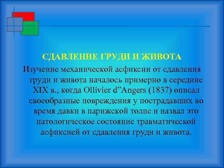 СДАВЛЕНИЕ ГРУДИ И ЖИВОТА Изучение механической асфиксии от сдавления груди и живота началось примерно в середине XIX в. , когда Ollivier d”Angers (1837) описал своеобразные повреждения у пострадавших во время давки в парижской толпе и назвал это патологическое состояние травматической асфиксией от сдавления груди и живота.