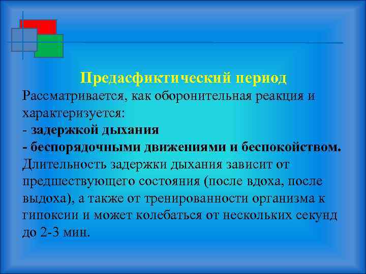 Предасфиктический период Рассматривается, как оборонительная реакция и характеризуется: - задержкой дыхания - беспорядочными движениями и беспокойством. Длительность задержки дыхания зависит от предшествующего состояния (после вдоха, после выдоха), а также от тренированности организма к гипоксии и может колебаться от нескольких секунд до 2 -3 мин.