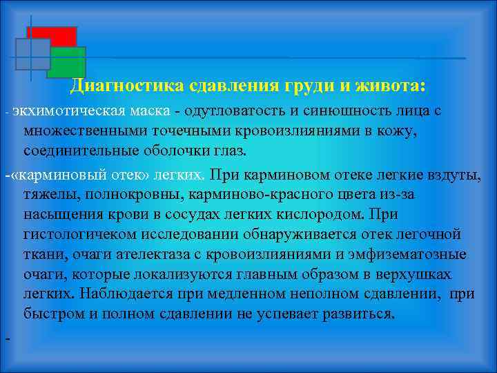 Диагностика сдавления груди и живота: - экхимотическая маска - одутловатость и синюшность лица с множественными точечными кровоизлияниями в кожу, соединительные оболочки глаз. - «карминовый отек» легких. При карминовом отеке легкие вздуты, тяжелы, полнокровны, карминово-красного цвета из-за насыщения крови в сосудах легких кислородом. При гистологичеком исследовании обнаруживается отек легочной ткани, очаги ателектаза с кровоизлияниями и эмфизематозные очаги, которые локализуются главным образом в верхушках легких. Наблюдается при медленном неполном сдавлении, при быстром и полном сдавлении не успевает развиться. -