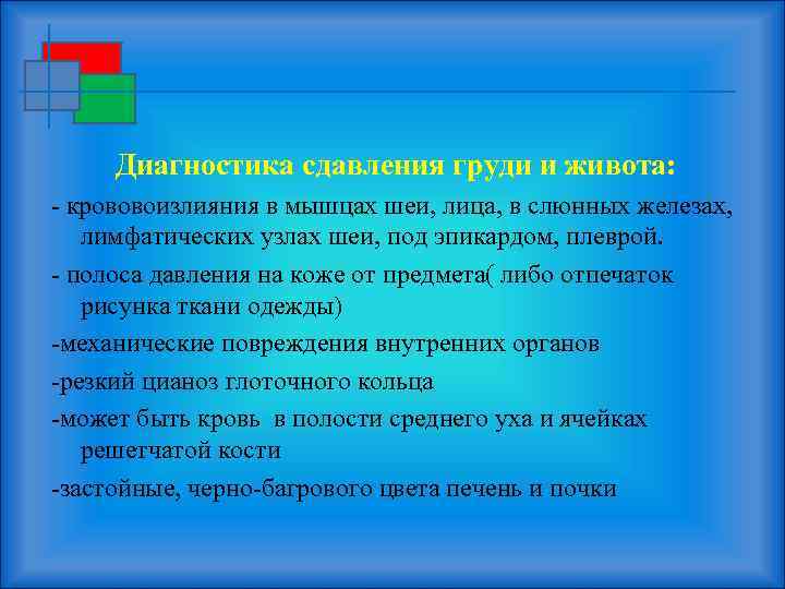 Диагностика сдавления груди и живота: - крововоизлияния в мышцах шеи, лица, в слюнных железах, лимфатических узлах шеи, под эпикардом, плеврой. - полоса давления на коже от предмета( либо отпечаток рисунка ткани одежды) -механические повреждения внутренних органов -резкий цианоз глоточного кольца -может быть кровь в полости среднего уха и ячейках решетчатой кости -застойные, черно-багрового цвета печень и почки