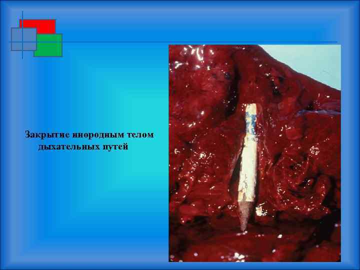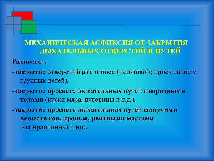 МЕХАНИЧЕСКАЯ АСФИКСИЯ ОТ ЗАКРЫТИЯ ДЫХАТЕЛЬНЫХ ОТВЕРСТИЙ И ПУТЕЙ Различают: -закрытие отверстий рта и носа (подушкой; присыпание у грудных детей). -закрытие просвета дыхательных путей инородными телами (куски мяса, пуговицы и т. д. ). -закрытие просвета дыхательных путей сыпучими веществами, кровью, рвотными массами (аспирационный тип).