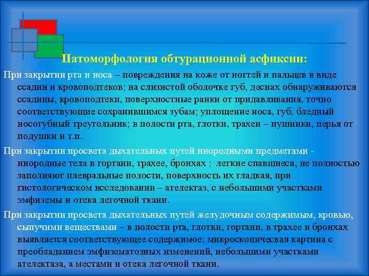 Патоморфология обтурационной асфиксии: При закрытии рта и носа – повреждения на коже от ногтей и пальцев в виде ссадин и кровоподтеков; на слизистой оболочке губ, деснах обнаруживаются ссадины, кровоподтеки, поверхностные ранки от придавливания, точно соответствующие сохранившимся зубам; уплощение носа, губ, бледный носогубный треугольник; в полости рта, глотки, трахеи – пушинки, перья от подушки и т. п. При закрытии просвета дыхательных путей инородными предметами - инородные тела в гортани, трахее, бронхах ; легкие спавшиеся, не полностью заполняют плевральные полости, поверхность их гладкая, при гистологическом исследовании – ателектаз, с небольшими участками эмфиземы и отека легочной ткани. При закрытии просвета дыхательных путей желудочным содержимым, кровью, сыпучими веществами – в полости рта, глотки, гортани, в трахее и бронхах выявляется соответствующее содержимое; микроскопическая картина с преобладанием эмфизематозных изменений, небольшими участками ателектаза, а местами и отека легочной ткани.
