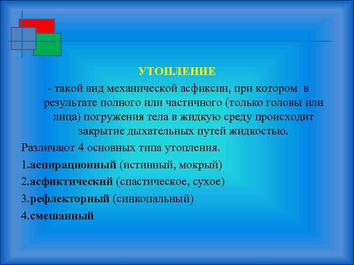 УТОПЛЕНИЕ - такой вид механической асфиксии, при котором в результате полного или частичного (только головы или лица) погружения тела в жидкую среду происходит закрытие дыхательных путей жидкостью. Различают 4 основных типа утопления. 1. аспирационный (истинный, мокрый) 2. асфиктический (спастическое, сухое) 3. рефлекторный (синкопальный) 4. смешанный