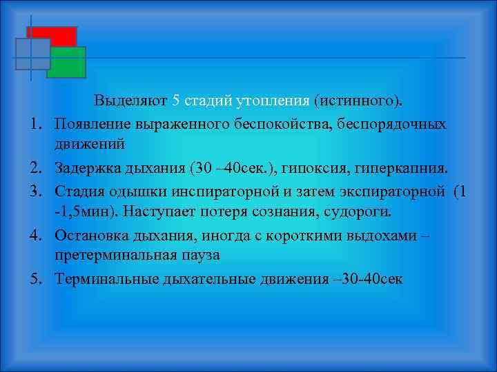 1. 2. 3. 4. 5. Выделяют 5 стадий утопления (истинного). Появление выраженного беспокойства, беспорядочных движений Задержка дыхания (30 – 40 сек. ), гипоксия, гиперкапния. Стадия одышки инспираторной и затем экспираторной (1 -1, 5 мин). Наступает потеря сознания, судороги. Остановка дыхания, иногда с короткими выдохами – претерминальная пауза Терминальные дыхательные движения – 30 -40 сек