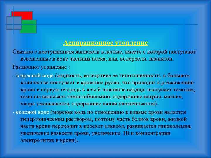 Аспирационное утопление Связано с поступлением жидкости в легкие, вместе с которой поступают взвешенные в воде частицы песка, ила, водоросли, планктон. Различают утопление : - в пресной воде (жидкость, вследствие ее гипотоничности, в большом количестве поступает в кровяное русло, что приводит к разжижению крови в первую очередь в левой половине сердца; наступает гемолиз, гемолиз вызывает гемоглобинемию, содержание натрия, магния, хлора уменьшается, содержание калия увеличивается). - соленой воде (морская вода по отношению к плазме крови является гипертоническим раствором, поэтому часть белков крови, жидкой части крови переходит в просвет альвеол, развивается гиповолемия, увеличение вязкости крови, увеличение Ht и концентрации электролитов в крови).