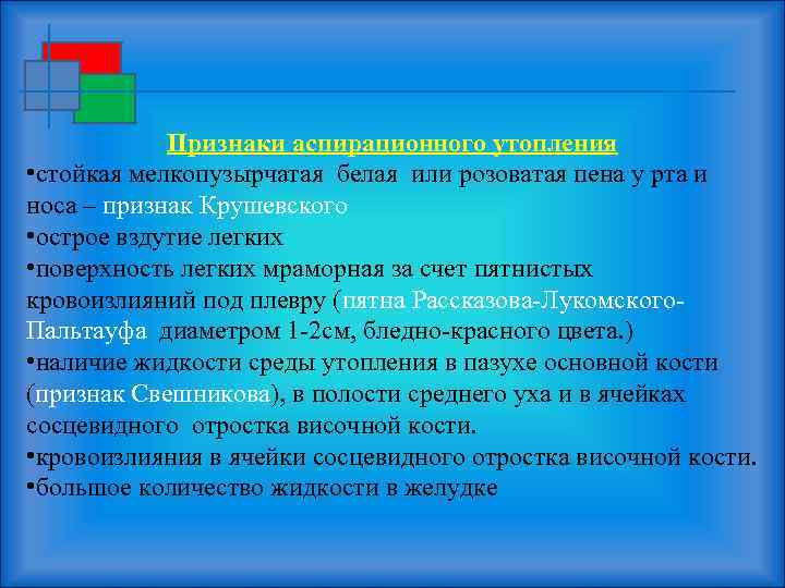 Признаки аспирационного утопления • стойкая мелкопузырчатая белая или розоватая пена у рта и носа – признак Крушевского • острое вздутие легких • поверхность легких мраморная за счет пятнистых кровоизлияний под плевру (пятна Рассказова-Лукомского. Пальтауфа диаметром 1 -2 см, бледно-красного цвета. ) • наличие жидкости среды утопления в пазухе основной кости (признак Свешникова), в полости среднего уха и в ячейках сосцевидного отростка височной кости. • кровоизлияния в ячейки сосцевидного отростка височной кости. • большое количество жидкости в желудке