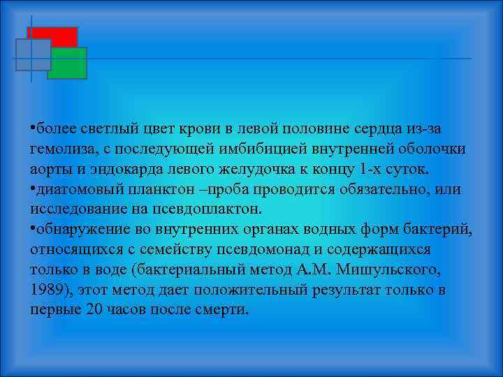 • более светлый цвет крови в левой половине сердца из-за гемолиза, с последующей имбибицией внутренней оболочки аорты и эндокарда левого желудочка к концу 1 -х суток. • диатомовый планктон –проба проводится обязательно, или исследование на псевдоплактон. • обнаружение во внутренних органах водных форм бактерий, относящихся с семейству псевдомонад и содержащихся только в воде (бактериальный метод А. М. Мишульского, 1989), этот метод дает положительный результат только в первые 20 часов после смерти.