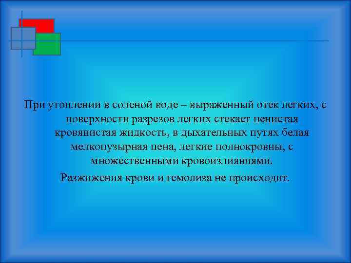 При утоплении в соленой воде – выраженный отек легких, с поверхности разрезов легких стекает пенистая кровянистая жидкость, в дыхательных путях белая мелкопузырная пена, легкие полнокровны, с множественными кровоизлияниями. Разжижения крови и гемолиза не происходит.