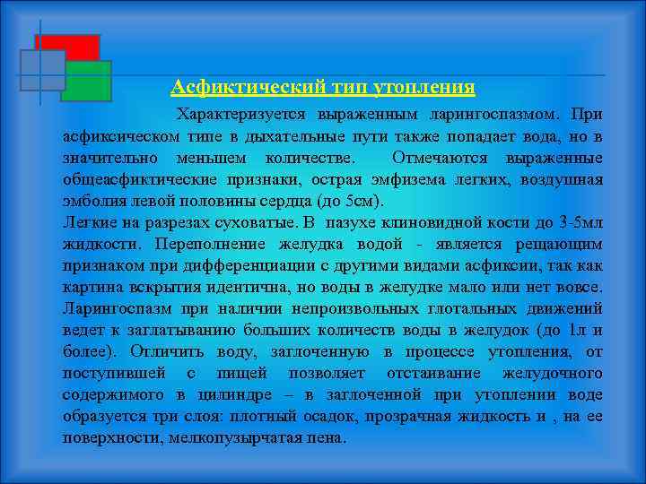 Асфиктический тип утопления Характеризуется выраженным ларингоспазмом. При асфиксическом типе в дыхательные пути также попадает вода, но в значительно меньшем количестве. Отмечаются выраженные общеасфиктические признаки, острая эмфизема легких, воздушная эмболия левой половины сердца (до 5 см). Легкие на разрезах суховатые. В пазухе клиновидной кости до 3 -5 мл жидкости. Переполнение желудка водой - является рещающим признаком при дифференциации с другими видами асфиксии, так картина вскрытия идентична, но воды в желудке мало или нет вовсе. Ларингоспазм при наличии непроизвольных глотальных движений ведет к заглатыванию больших количеств воды в желудок (до 1 л и более). Отличить воду, заглоченную в процессе утопления, от поступившей с пищей позволяет отстаивание желудочного содержимого в цилиндре – в заглоченной при утоплении воде образуется три слоя: плотный осадок, прозрачная жидкость и , на ее поверхности, мелкопузырчатая пена.