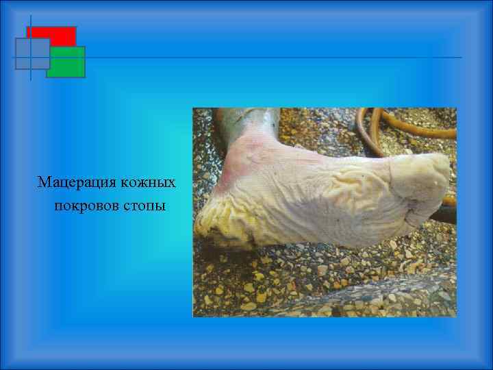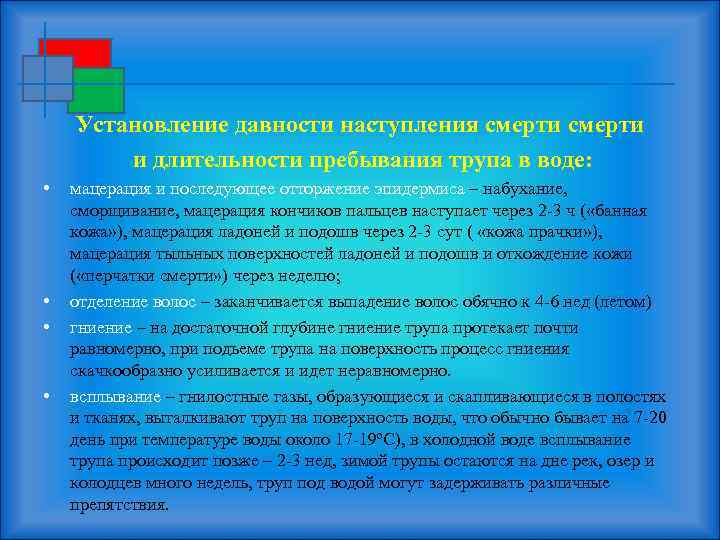 Установление давности наступления смерти и длительности пребывания трупа в воде: • • мацерация и последующее отторжение эпидермиса – набухание, сморщивание, мацерация кончиков пальцев наступает через 2 -3 ч ( «банная кожа» ), мацерация ладоней и подошв через 2 -3 сут ( «кожа прачки» ), мацерация тыльных поверхностей ладоней и подошв и отхождение кожи ( «перчатки смерти» ) через неделю; отделение волос – заканчивается выпадение волос обячно к 4 -6 нед (летом) гниение – на достаточной глубине гниение трупа протекает почти равномерно, при подьеме трупа на поверхность процесс гниения скачкообразно усиливается и идет неравномерно. всплывание – гнилостные газы, образующиеся и скапливающиеся в полостях и тканях, выталкивают труп на поверхность воды, что обычно бывает на 7 -20 день при температуре воды около 17 -19ºС), в холодной воде всплывание трупа происходит позже – 2 -3 нед, зимой трупы остаются на дне рек, озер и колодцев много недель, труп под водой могут задерживать различные препятствия.