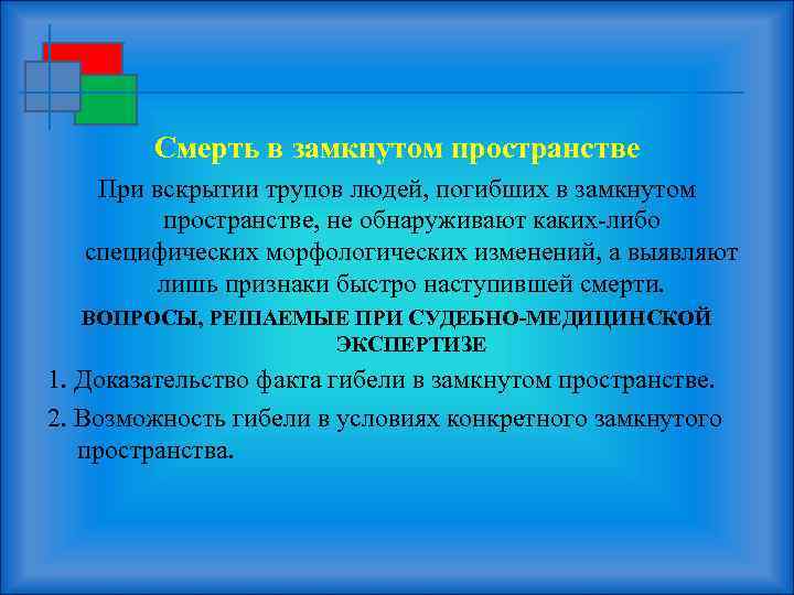 Смерть в замкнутом пространстве При вскрытии трупов людей, погибших в замкнутом пространстве, не обнаруживают каких-либо специфических морфологических изменений, а выявляют лишь признаки быстро наступившей смерти. ВОПРОСЫ, РЕШАЕМЫЕ ПРИ СУДЕБНО-МЕДИЦИНСКОЙ ЭКСПЕРТИЗЕ 1. Доказательство факта гибели в замкнутом пространстве. 2. Возможность гибели в условиях конкретного замкнутого пространства.