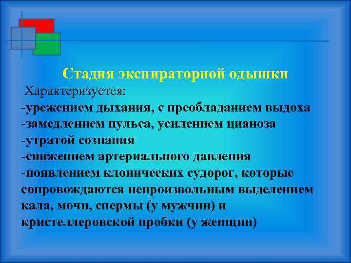 Стадия экспираторной одышки Характеризуется: -урежением дыхания, с преобладанием выдоха -замедлением пульса, усилением цианоза -утратой сознания -снижением артериального давления -появлением клонических судорог, которые сопровождаются непроизвольным выделением кала, мочи, спермы (у мужчин) и кристеллеровской пробки (у женщин)