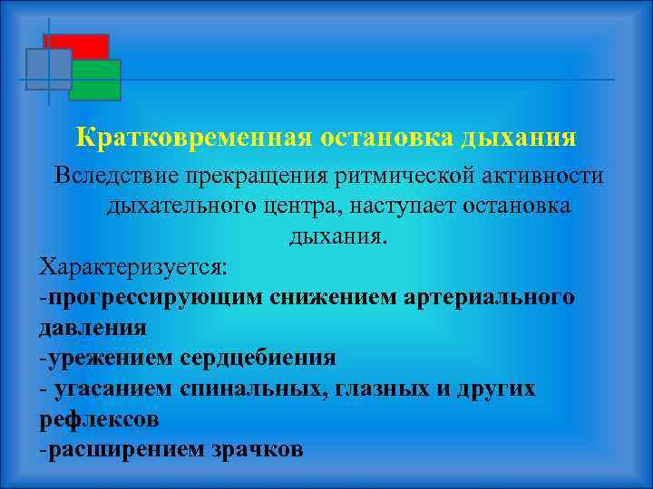 Кратковременная остановка дыхания Вследствие прекращения ритмической активности дыхательного центра, наступает остановка дыхания. Характеризуется: -прогрессирующим снижением артериального давления -урежением сердцебиения - угасанием спинальных, глазных и других рефлексов -расширением зрачков