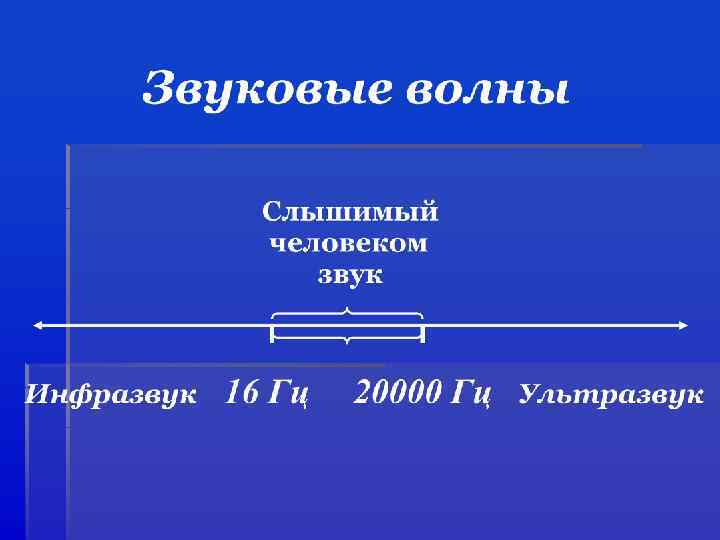 Звуковые волны – упругие волны, способные вызывать слуховые ощущения. Органы слуха человека способны воспринимать звуки с частотой в пределах примерно от 16 Гц до 20000 Гц. Продольные волны в среде с частотой изменения давления менее 16 Гц называют ИНФРАЗВУКОМ, с частотой более 20000 Гц – УЛЬТРАЗВУКОМ. Инфра- и ультразвуковые волны не воспринимаются человеческим ухом.