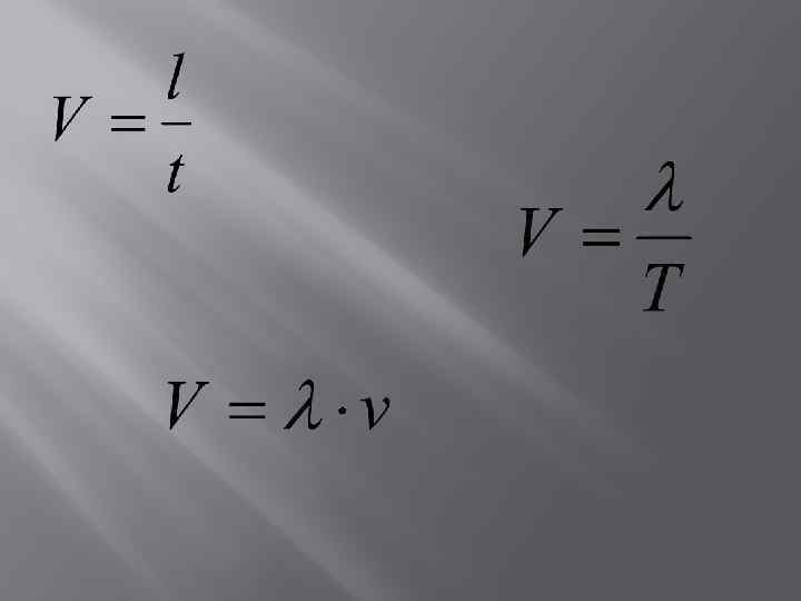 Параметры волны 1. υ (м/c)– скорость распространения волны 2. λ (м) - длина волны 3. А (м) – амплитуда колебаний волны (наибольшее смещение тела от его положения равновесия) 4. L (м) – путь волны по прямой 5. Т (с)– период волны (время, за которое волна проходит путь λ) 6. ν (Гц) - частота колебаний волны (число волн, возникающих за 1 секунд) 7. t (с) - время, в течении которого распространяется волна. 8. х (м)- отклонение каждой точки от положения равновесия 9. r (м)– расстояние точки от источника колебаний