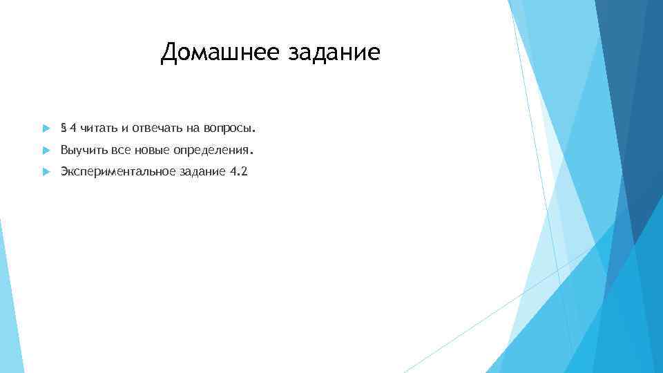 Домашнее задание § 4 читать и отвечать на вопросы. Выучить все новые определения. Экспериментальное задание 4. 2