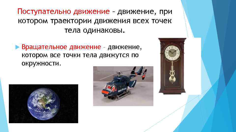 Поступательно движение – движение, при котором траектории движения всех точек тела одинаковы. Вращательное движение – движение, при котором все точки тела движутся по окружности.