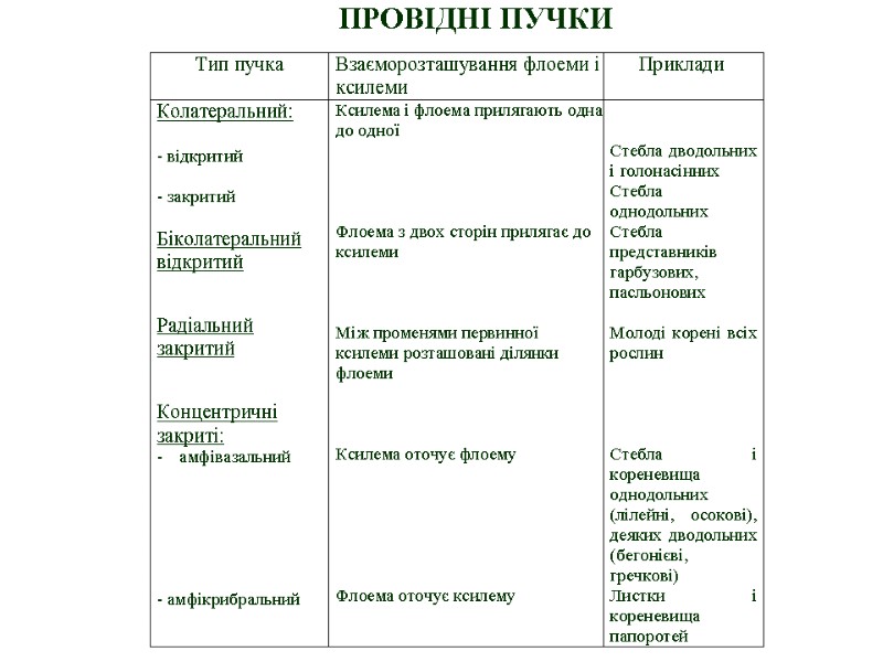Типи провідних пучків: відкритий закритий біколатеральний колатеральний ф ф ка кс