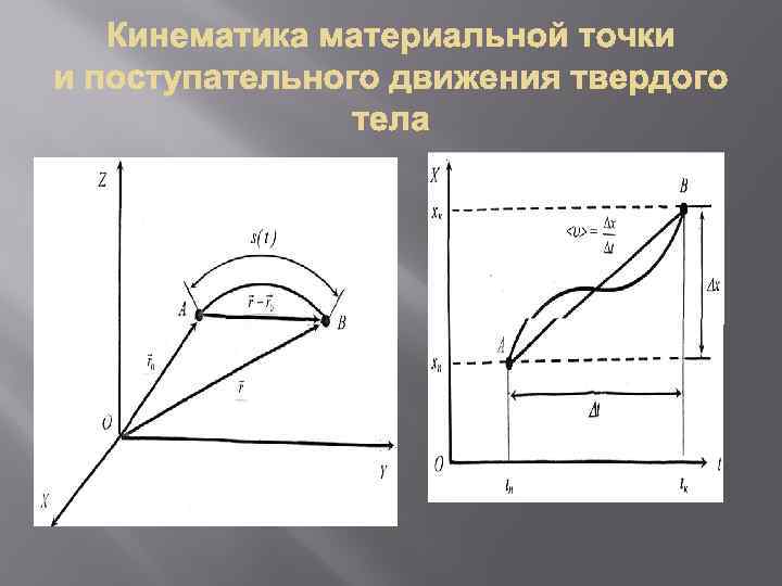 Основные определения Механика это раздел физики, изучающий механическое движение материальных тел и взаимодействие этих тел. Механическое движение - изменение положения тела со временем относительно другого тела или системы тел, которые условно считают неподвижными. В механике для описания реальных тел используют упрощенные модели, такие как материальная точка или абсолютно твердое тело. Материальная точка это тело, формою и размерами которого в условиях данной задачи можно пренебречь. Абсолютно твердое тело это тело, деформациями которого в условиях данной задачи можно пренебречь, и расстояние между двумя точками которого всегда остается неизменным. Система отсчета это совокупность системы координат и часов, связанных с телом, относительно которого изучается движение каких-либо иных материальных точек или тел. Например, в декартовой системе координат положение точки А в данный момент времени характеризуется тремя координатами X, Y и Z.
