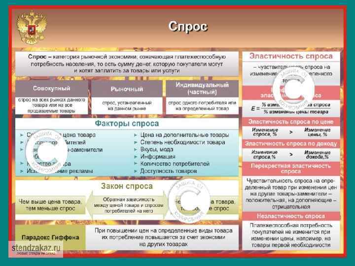 Закон спроса объективный экономический закон, устанавливающий зависимость объема спроса на товар на рынке от цены: чем выше цена, тем ниже величина спроса на товар ЗС объясняется следующими факторами: А)Закон убывающей предельной полезности; Б) Эффект дохода; В) Эффект замещения. • • • Из закона спроса есть несколько исключений: Эффект Гиффена; Эффект Веблена; Эффект Сноба; Эффект присоединения к большинству; конформизм.
