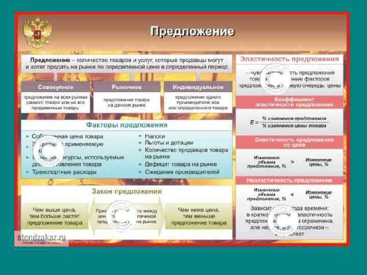 Эластичность предложения (ЭП) - это его гибкость, реакция на изменение определяющих его факторов (цены или издержек). • Факторы, влияющие на ЭП: -Возможность длительного хранения товара. П скоропортящихся товаров не эластично. -Затраты на хранение. При высоких затратах П не эластично. - Условия пр-ва товаров. Например, в с/х не в любой сезон можно увеличить пр-во. -Время. В коротком периоде П менее эластично.