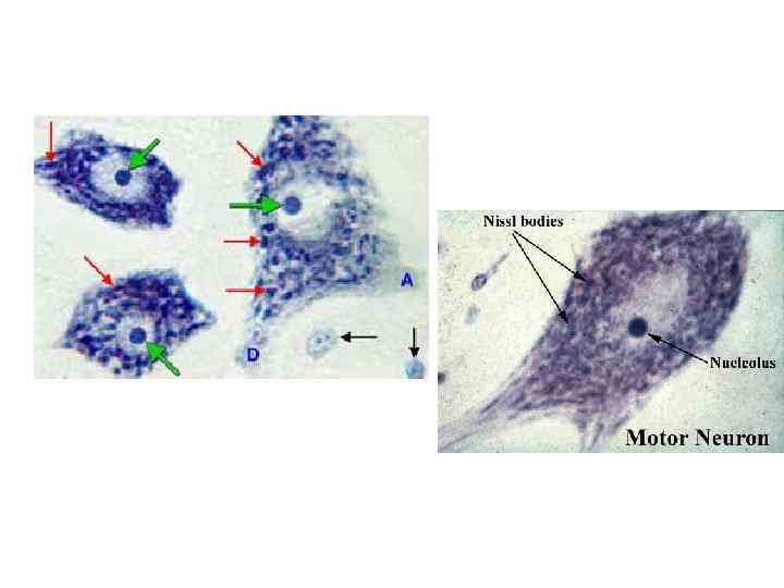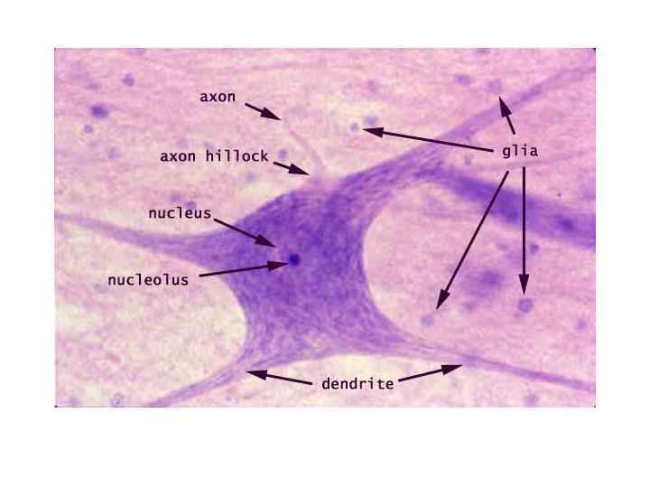 Хроматофильная субстанция (субстанция Ниссля) в мультиполярных нейронах спинного мозга. Окраска по Нисслю • • • Метод Ниссля основан на окраске рибонуклеопротеидов (рибосомы и Гр. ЭС) основными красителями (толуидиновым синим, крезилвиолетом). На малом увеличении найти крупный мультиполярный (моторный) нейрон в переднем роге серого вещества спинного мозга. При большом увеличении обратить внимание на светлое ядро, хорошо заметное ядрышко, на наличие глыбок хроматофильной субстанции в теле и дендритах нейрона и на отсутствие их в аксоне и аксональном холмике.