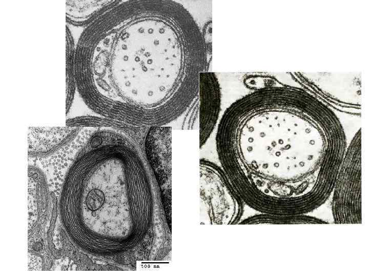 Миелиновые нервные волокна (расщепленный препарат седалищного нерва). Окраска осмиевой кислотой. Осмиевая кислота окрашивает миелиновую оболочку в чёрный цвет из-за наличия в ней липидов. На малом увеличении найти изолированное миелиновое волокно. При большом увеличении в каждом волокне виден бледно окрашенный осевой цилиндр, по бокам которого располагается тёмный миелиновый слой с узловыми перехватами и насечками, имеющих вид узких светлых косых щелей. Неврилемма при слегка опущенном конденсоре видна как блестящая полоса на периферии волокна, она особенно заметна в области узлового перехвата.