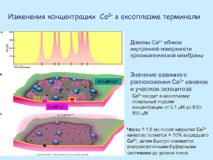 Изменения концентрации Са 2+ в аксоплазме терминали Домены Са 2+ вблизи внутренней поверхности пресинаптической мембраны <0. 1 m. M Ca 2+ 2 m. M Ca 2+ Значение взаимного расположения Са 2+ каналов и участков экзоцитоза Са 2+ входит в аксоплазму: локальный подъем концентрации от 0. 1 m. M до 600800 m. M Через 1 -1. 5 мс после закрытия Са 2+ каналов: остается < 10% вошедшего Са 2+, затем быстро снижается внутриклеточными буферными системами до уровня покоя