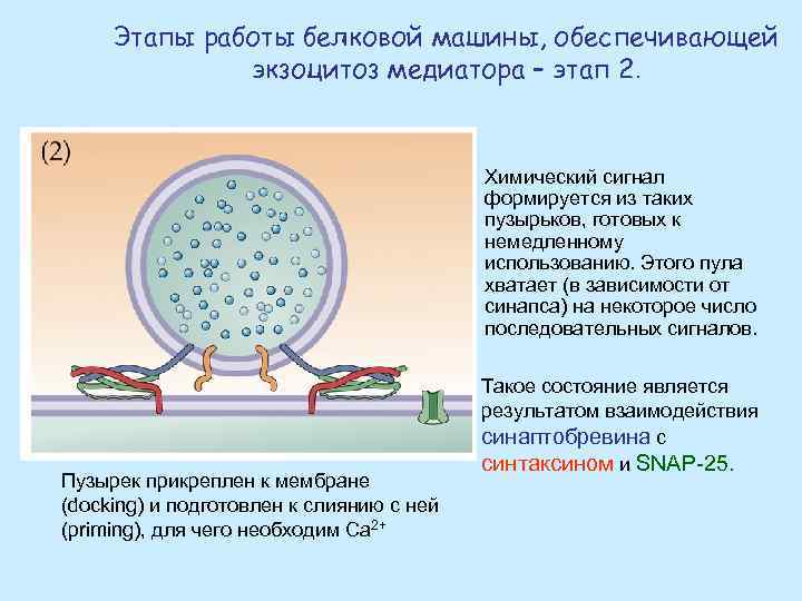 Этапы работы белковой машины, обеспечивающей экзоцитоз медиатора – этап 2. Химический сигнал формируется из таких пузырьков, готовых к немедленному использованию. Этого пула хватает (в зависимости от синапса) на некоторое число последовательных сигналов. Пузырек прикреплен к мембране (docking) и подготовлен к слиянию с ней (priming), для чего необходим Са 2+ Такое состояние является результатом взаимодействия синаптобревина с синтаксином и SNAP-25.
