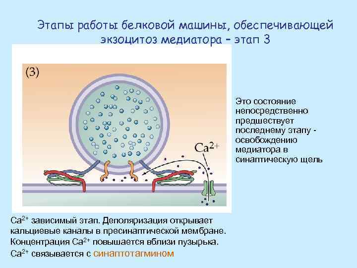 Этапы работы белковой машины, обеспечивающей экзоцитоз медиатора – этап 3 Это состояние непосредственно предшествует последнему этапу освобождению медиатора в синаптическую щель Са 2+ зависимый этап. Деполяризация открывает кальциевые каналы в пресинаптической мембране. Концентрация Са 2+ повышается вблизи пузырька. Са 2+ связывается с синаптотагмином