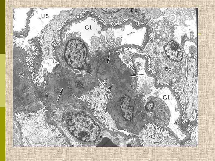 Морфология Ig. А-нефропатии q Определяющий симптом – диффузные отложения Ig. A в мезангии, коррелирующие с электронноплотными депозитами в мезангии при электронной микроскопии q Могут наблюдаться депозиты С 3, Ig. G, реже Ig. M, а также Ig. A в капиллярной стенке q При световой микроскопии – от минимальных изменений до сегментарной или диффузной мезангиальной гиперцеллюлярности, с развитием фокального сегментарного склероза, атрофии канальцев и интерстициального фиброза q При электронной микроскопии – высокая частота фокального истончения ГБМ