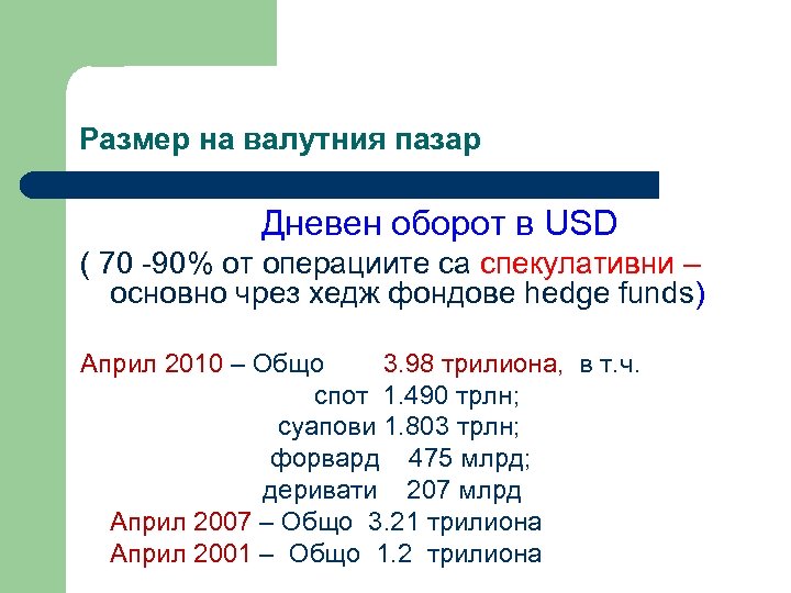 Размер на валутния пазар Дневен оборот в USD ( 70 -90% от операциите са спекулативни – основно чрез хедж фондове hedge funds) Април 2010 – Общо 3. 98 трилиона, в т. ч. спот 1. 490 трлн; суапови 1. 803 трлн; форвард 475 млрд; деривати 207 млрд Април 2007 – Общо 3. 21 трилиона Април 2001 – Общо 1. 2 трилиона