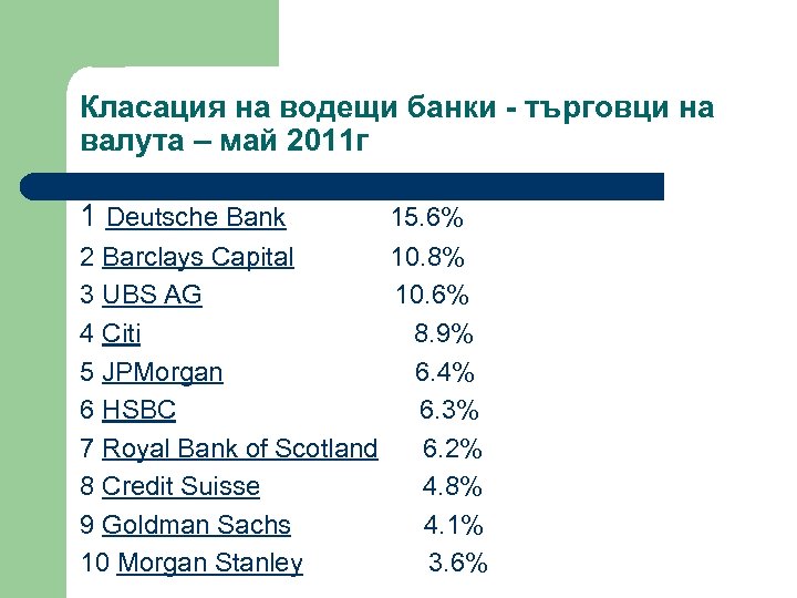 Класация на водещи банки - търговци на валута – май 2011 г 1 Deutsche Bank 15. 6% 2 Barclays Capital 10. 8% 3 UBS AG 10. 6% 4 Citi 8. 9% 5 JPMorgan 6. 4% 6 HSBC 6. 3% 7 Royal Bank of Scotland 6. 2% 8 Credit Suisse 4. 8% 9 Goldman Sachs 4. 1% 10 Morgan Stanley 3. 6%