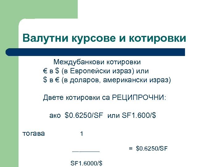 Валутни курсове и котировки Междубанкови котировки € в $ (в Европейски израз) или $ в € (в доларов, американски израз) Двете котировки са РЕЦИПРОЧНИ: ако $0. 6250/SF или SF 1. 600/$ тогава 1 ____ = $0. 6250/SF SF 1. 6000/$